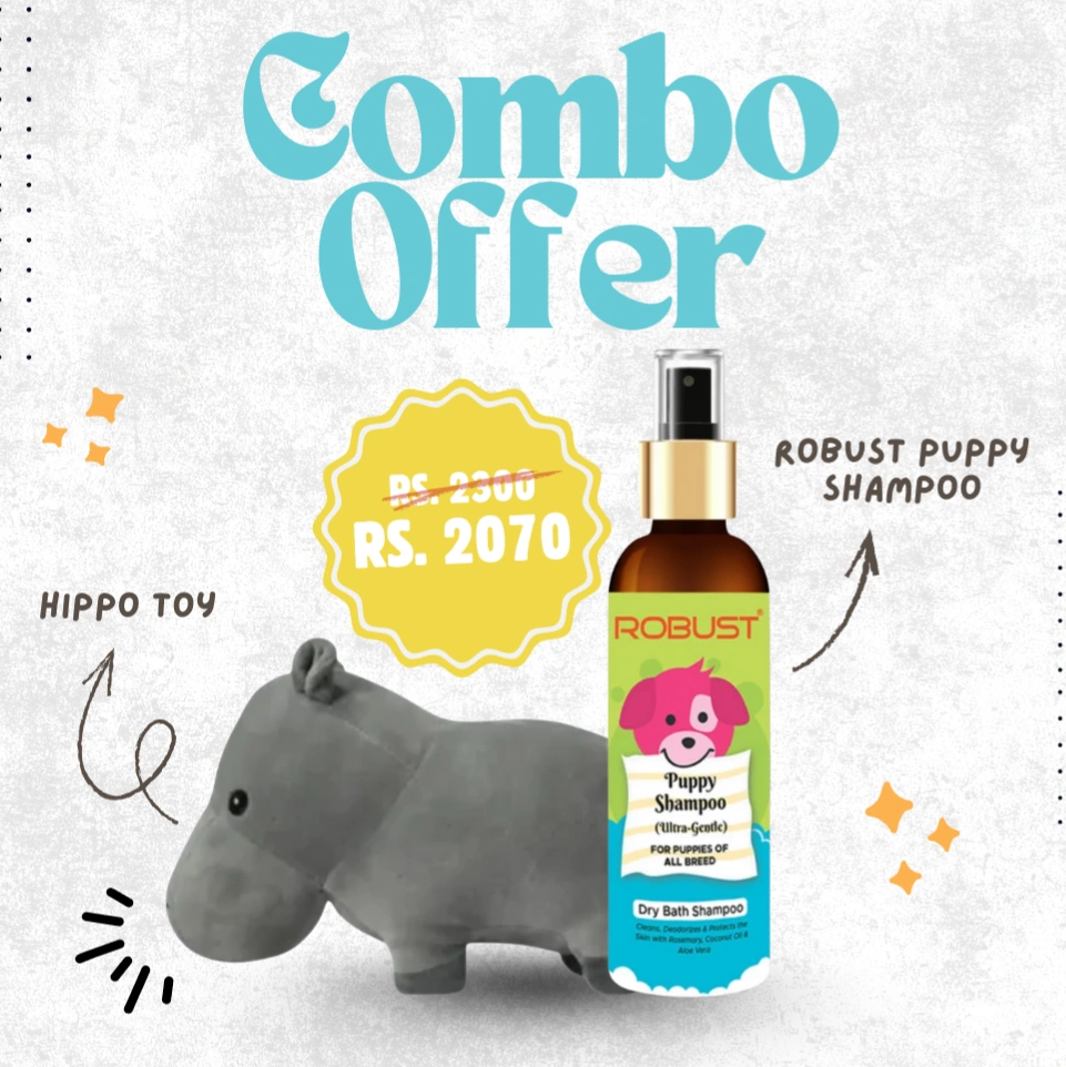Keep your pup entertained AND fresh with our Hippo Toy + Robust Puppy Shampoo combo! The adorable chew-safe hippo keeps them busy, while the gentle shampoo leaves their coat soft and shiny. A complete puppy care bundle every pet parent will love!
